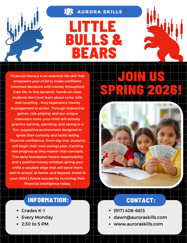 Give your child a powerful advantage with financial literacy- the key to lifelong success. This interactive class introduces essential money skills like earning, saving, spending, and budgeting in a fun, risk- free way. Your child will strengthen math skills, learn to distinguish needs from want, and discover the true value of money through hand-on activities and real-life scenarios.