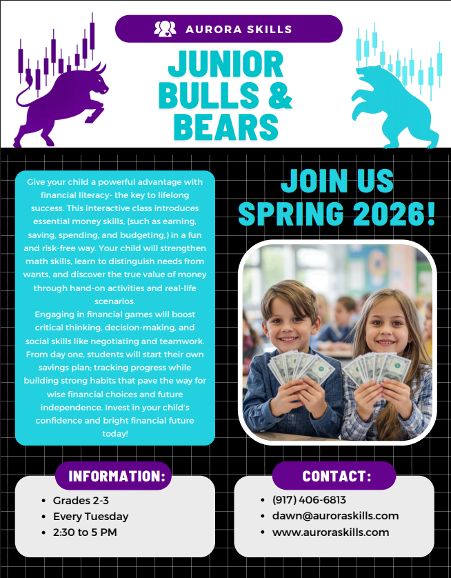 Engaging in financial games will boost critical thinking, decision-making, and social skills like negotiating and teamwork. From day one, students will start their own savings plan, tracking progress while building strong habits that pave the way for wise financial choices and future independence. Invest in your child’s confidence and bright financial future today!