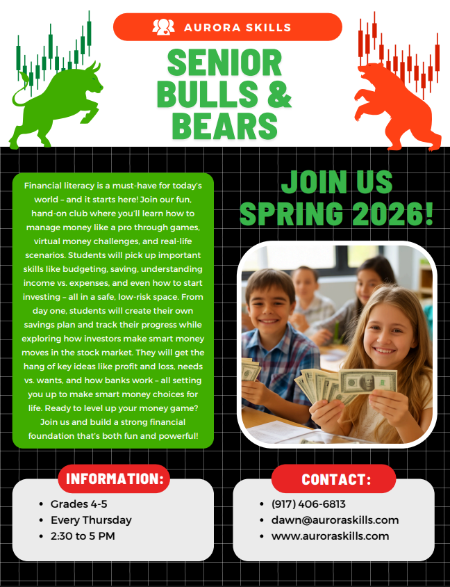 Financial literacy is a must-have for today’s world – and it starts here! Join our fun, hand-on club where you’ll learn how to manage money like a pro through games, virtual money challenges, and real-life scenarios. Students will pick up important skills like budgeting, saving, understanding income vs. expenses, and even how to start investing – all in a safe, low-risk space. From day one, students will create their own savings plan and track their progress while exploring how investor make smart money moves in the stock market. They will get the hang of key ideas like profit and loss, needs vs. wants, and how banks work – all setting you up to make smart money choices for life. Ready to level up for money game? Join us and build a strong financial foundation that’s both fun and powerful!