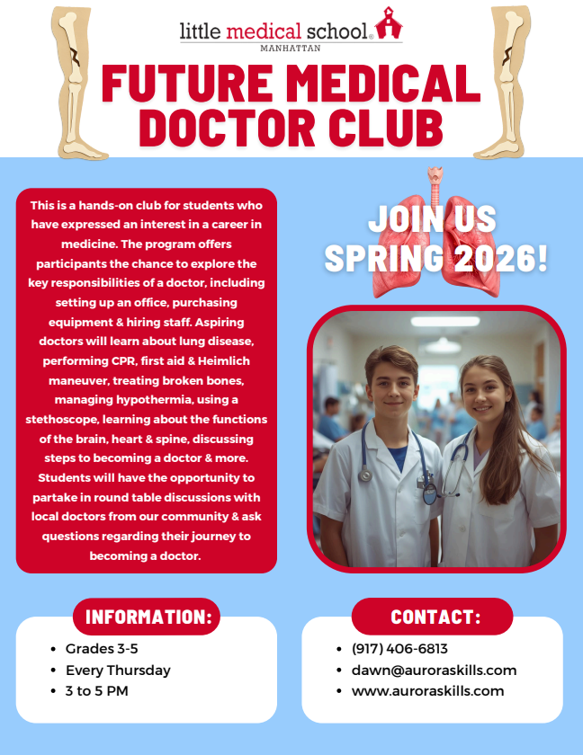 This is a hands-on club for students who have expressed an interest in a career in medicine. The program offers participants the opportunity to explore the key responsibilities of a doctor, including setting up an office, purchasing equipment and hiring staff. Aspiring doctors will learn about lung disease, performing CPR, first aid and Heimlich maneuver, treating broken bones, managing hypothermia, using a stethoscope, learning about the functions of the brain, heart and spine, discussing steps to becoming a doctor and more. Students will have the opportunity to partake in round table discussions with local doctors from our community and ask questions regarding their journey to becoming a doctor.